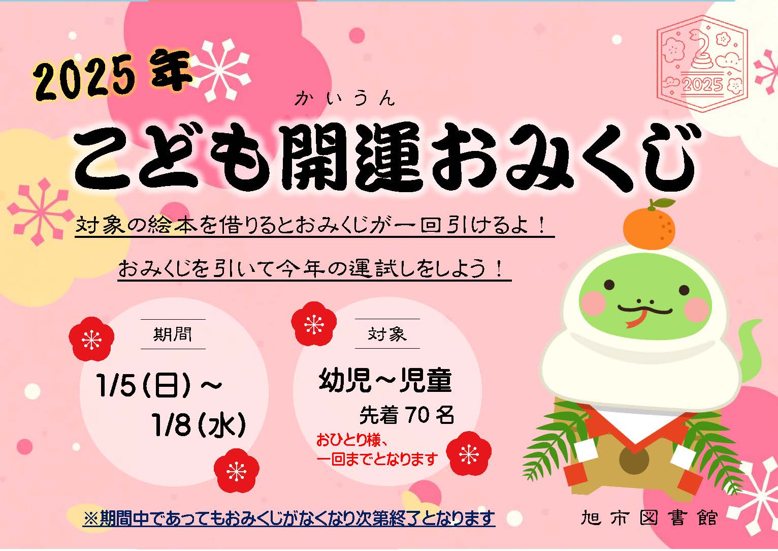 2024年12月17日 こども開運おみくじ2025 旭市図書館では、新春のお楽しみ企画として「開運おみくじ2025」を開催します。 図書館職員が選んだおすすめの本をおみくじで紹介しています。 おみくじを引いて図書館おすすめのラッキー本を借りてみましょう! 日時 令和7年1月5日(日)~1月8日(水)※なくなり次第終了 申し込み 不要 対象 幼児~児童(先着70名) お問い合わせ 旭市図書館(TEL 0479-62-2560)